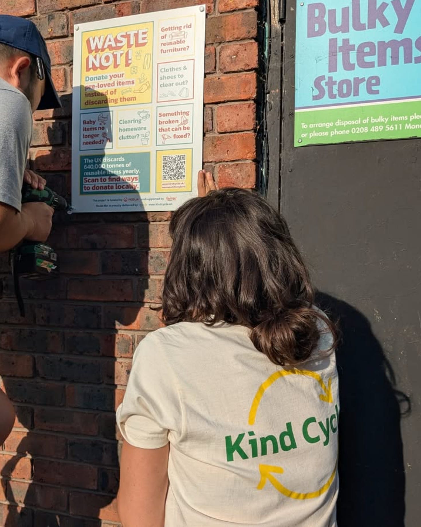 Step three The group created signage for bulky waste sites, with a QR code that takes people to the relevant section of a website they built (translated into the seven most locally spoken languages). Among other useful information, it provides details of all the organisations that’ll come and pick up your unwanted but still useable furniture/ clothes/ cookware etc. FOR FREE.